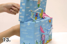 Using poster paints, paint the box lid blue with some white stripes for water and waves.